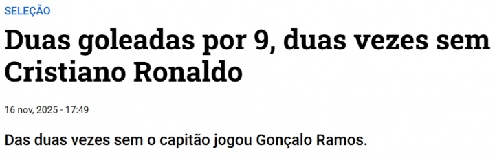 11月17日讯 葡萄牙活着初赛中9-1大捷亚好意思尼亚,创造了队史第二大赢球比分记录。葡媒Renascença指出,葡萄牙比年来两次创造相通比分,C罗均未在场。 9-1亚好意思尼亚,这是葡萄牙队史第二次获取这么的比分,上一次是在2023年9月对阵卢森堡的欧初赛上,那时葡萄牙9-0狂胜卢森堡。 而在这两场比赛中,C罗均因停赛缺席,贡萨洛·拉莫斯则两次代替C罗首发。在对阵卢森堡的比赛中,拉莫斯梅开二度,而本轮对阵亚好意思尼亚,他孝敬了一球一助。 【有关】9-1狂胜亚好意思尼亚!葡萄牙一战创下队史第二大比分获胜