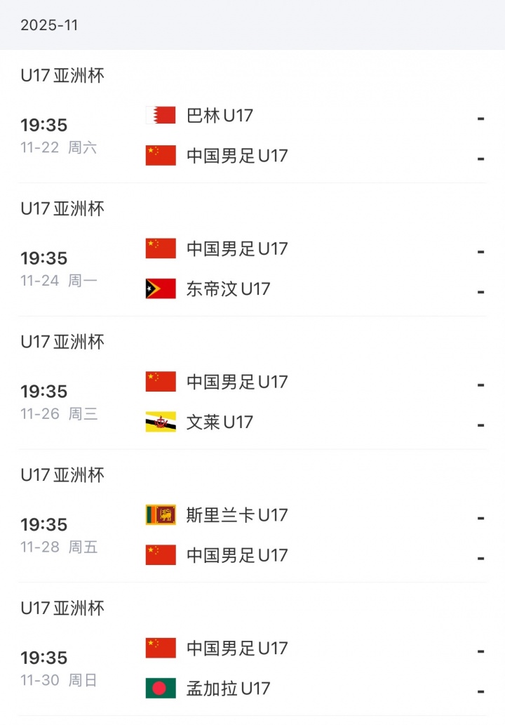 11月21日讯 U17亚初赛国足名单出炉,邝兆镭、帅惟浩领衔,谢晋、万项在列。U16国足将在翌日的亚初赛的首场比赛中对阵巴林队。 国少队23东说念主球衣号码: 门将:1-秦子牛、12-陈城云、23-曹钰 后卫:2-金峰、4-南子勋、5-李钧鹏、6-金昱成、8-张旭尧、13-李铭杰、14-张君豪、22-程晟涵 中场:3-谢晋、7-周雨诺、10-邝兆镭、11-何想凡、15-孔玺诺、16-陈炳汐、17-王贺毅、18-徐正鹏、19-万项 时尚:9-张伯霖、20-赵松源、21-帅惟浩 2026亚足联U17亚洲杯预选赛将于11月22日-30日在重庆市进行。中国U-16国度男人足球队将先后迎战巴林队、东帝汶队、文莱队、斯里兰卡队和孟加拉国队,争夺晋级来岁在沙特阿拉伯进行的U17亚洲杯决赛阶段比赛的经历。 亚初赛赛程↓