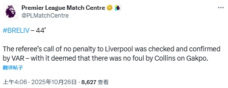 10月26日讯 利物浦vs布伦特福德第44分钟,加克波有一次禁区内倒地,裁判莫得判罚点球。 英超官方说明:主裁判未判给利物浦点球的决定经由VAR核查阐述,认定科...