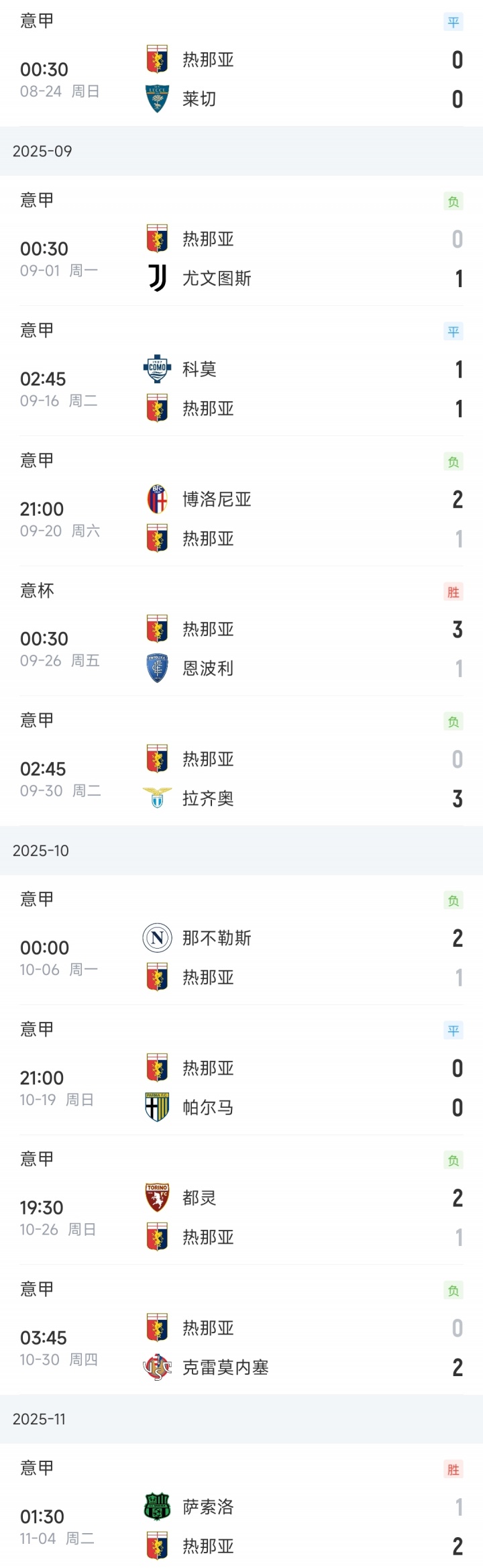 这是维埃拉下课后热那亚的首场比赛,由临时熏陶抓教。此前在维埃拉的抓教下,热那亚提神甲3平6负,无一胜绩,深陷意甲末尾。在热那亚获取首胜后,意甲垫底形成了佛罗伦萨,在皮奥利的抓教下,佛罗伦萨相通亦然无一胜绩😅