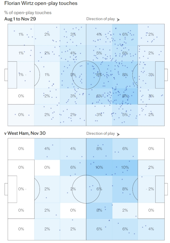 12月02日讯 在周末的英超联赛中,利物浦2-0投诚西汉姆联终于止住了连败的错误。本场比赛维尔茨也踢出了来到英超后的最好一战,《逐日电讯报》撰文点评了维尔茨的阐发。 利物浦在2-0西汉姆的比赛中,迎来了从低迷到“维尔茨式”新生的转换,这位以1.15亿英镑转会费加盟球队的中场相易官打出了他在英超最全面的阐发,印证了斯洛特围绕这位德国新星建队,从而支援这个赛季并稳住帅位的构思。 10号位真核 利物浦签下维尔茨,垂青的即是他游弋于防地之间以及掌控比赛节拍的才气。在对阵西汉姆的比赛中,维尔茨初次担任了真确的10号位,赫拉芬贝赫、麦卡利斯特和索博斯洛伊在他死后提供保护,索博斯洛伊阵一火了习尚的前插位置而坐镇右路。此前将维尔茨置入中场三东说念主组时,利物浦的攻防恒久失衡,本赛季初当维尔茨在场上丢球时,敌手就能邋遢发动反击,旧年那套熟谙的中场组合果决分解,队友之间的关连也着实离散。 而在伦敦碗,利物浦阵型昭着改善,维尔茨与中场队友的互动初现化学反映。不能否定的是,西汉姆予以了维尔茨安逸接球的空间,但他确乎展现出了更实足的信心和恶果,本应收货一球一助攻。 当利物浦丢失球权时,球员能飞速酿成围抢。值得细心的是,本场维尔茨在遑急三区和禁区内的传球数据着实与他本赛季的平均数据持平,这冒失能让他的撑持者论证他一直很优秀的不雅点,但数据无法体现的是,他本场的跑动速率、传球精度和躯壳对抗,较之前均有进步。 空间魔术师 维尔茨在德甲和国度队素有从边路开动、内切中路遑急的习尚,斯洛特在利物浦曾经如斯使用他,但俱乐部引进他的本意并非如斯。本轮最权贵的变化在于——他庸俗出当今球队左路隔邻,与加克波和凯尔凯兹合营默契。