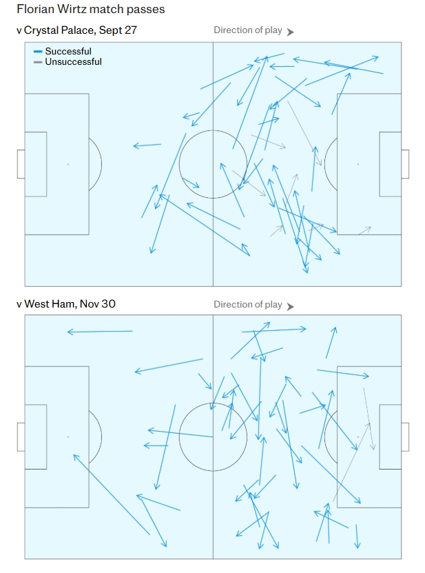 维尔茨接球区域占比 传球各人 95%的传球告捷率无疑是维尔茨最防备的标签,对阵西汉姆44次传球仅演叨2次,这与赛季初对阵布伦特福德(76%)和水晶宫(84%)时的低迷酿成显然对比。更要道的是,那两次演叨均为试图创造进球的要道区域传球。回溯10月对阵布伦特福德之役,他11次丢失球权中有5次发生在己方半场;而本轮他与队友合营时展现出更强的遑急推能源。