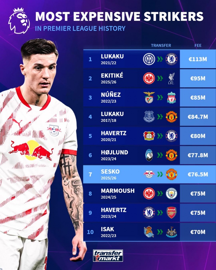 8月9日讯 德国转会市集清点了英超历史最贵时尚,曼联新援塞斯科7650万欧元排名第七,前十之中有三笔来回由曼联完成,而卢卡库和哈弗茨均两次上榜。 英超历史最贵时尚: 1、卢卡库(2021-22赛季外洋米兰→切尔西),1.13亿欧元 2、埃基蒂克(2025-26赛季法兰克福→利物浦),9500万欧元 3、努涅斯(2022-23赛季本菲卡→利物浦),8500万欧元 4、卢卡库(2017-18赛季埃弗顿→曼联),8470万欧元 5、哈弗茨(2020-21赛季勒沃库森→切尔西),8000万欧元 6、霍伊伦(2023-24赛季亚特兰大→曼联),7780万欧元 7、塞斯科(2025-26赛季RB莱比锡→曼联),7650万欧元 8(比肩)、马尔穆什(2024-25赛季法兰克福→曼城),7500万欧元 8(比肩)、哈弗茨(2023-24赛季切尔西→阿森纳),7500万欧元 10、伊萨克(2022-23赛季皇家社会→纽卡斯尔),7000万欧元 |