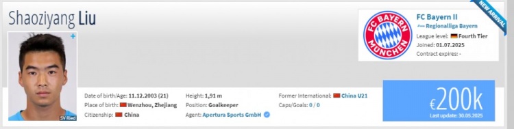 8月12日讯 据德转线路,刘邵子洋解放转会加盟拜仁二队。 刘邵子洋出生于武汉三镇青训,司职门将,现在身价20万欧。刘邵子洋18岁的时辰加盟拜仁,屡次被外租。 上赛季刘邵子洋效率的奥地利乙级球队SV霍恩遭逢左迁,他代表球队出场14次,完了1次零封。