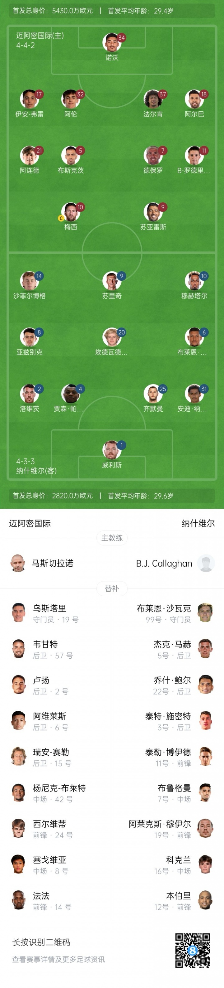 10月25日讯 好意思职联季后赛首轮,迈阿密海外对阵纳什维尔,赛前首发公布。 迈阿密海外首发:34-诺沃、17-伊安·弗雷、37-法尔肯、32-阿伦、18-阿尔巴、21-阿连德、7-德-保罗、5-布斯克茨、10-梅西、11-B·罗德里格斯、9-苏亚雷斯 迈阿密海外替补:19-乌斯塔里、57-韦甘特、15-瑞安-赛勒、2-卢扬、6-阿维莱斯、42-布莱特、8-塞戈维亚、14-法法 纳什维尔首发:1-威利斯、2-罗威茨、4-贾森·帕拉西奥斯、25-都默曼、31-安迪·纳加尔、6-布莱恩·阿科斯塔、8-亚兹别克、20-埃德瓦德·塔基斯、0-穆克塔尔、14-沙菲尔博格、9-苏里奇 纳什维尔替补:99-布莱恩·沙瓦克、3-泰特·施密特、5-马尔、7-布鲁格曼、11-泰勒·博伊德、12-本伯里、16-科克兰、19-阿莱克斯·穆伊尔、22-乔什·鲍尔 好意思职联季后赛首轮取舍三场两胜制,成例时刻打平后平直进行点球大战。