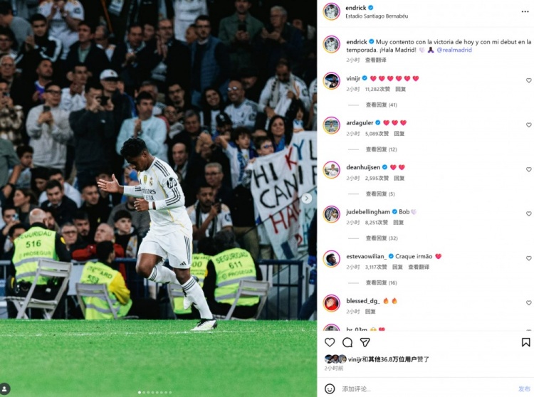 11月2日讯 在本轮西甲,皇马4-0大捷瓦伦西亚。 本场比赛恩德里克在尾声阶段替补登场,迎来本赛季初次登场,赛后恩德里克社媒发文写说念:“十分自豪大概获得今天的...