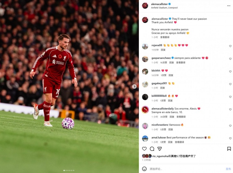 11月2日讯 本轮英超,利物浦2-0打败维拉,散伙联赛4连败。 本场比赛麦卡利斯特首发出战,赛后他也在个东谈主社媒晒出本场像片,配文写谈:“咱们的情谊恒久不会被...