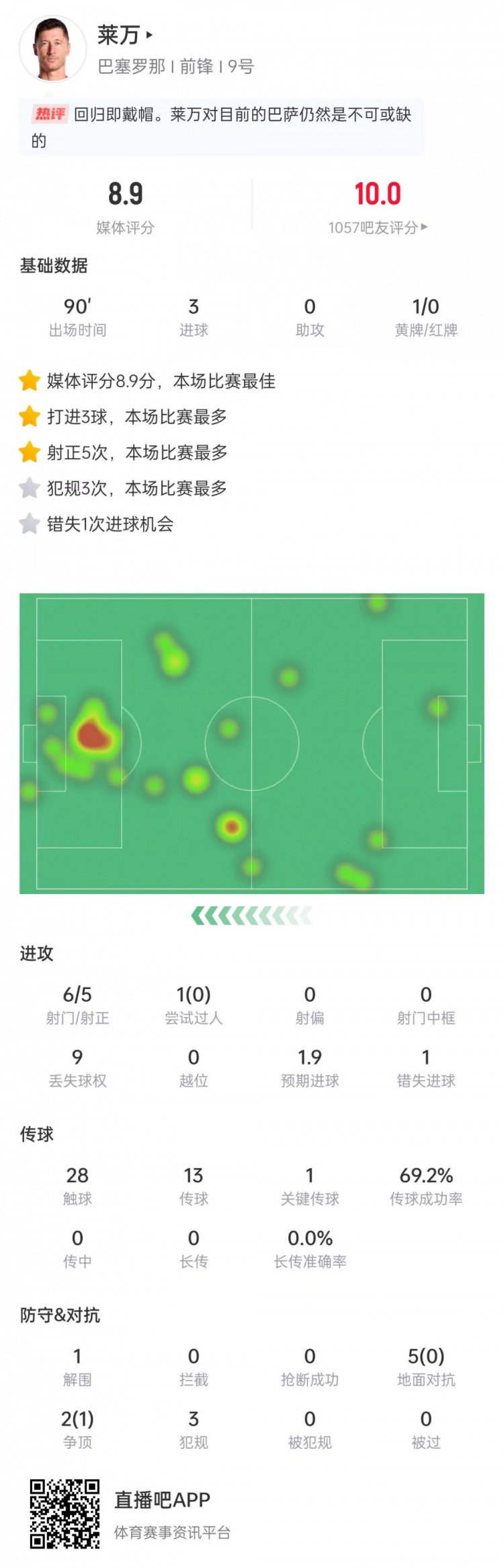 11月10日讯 西甲第12轮比赛,莱万献技帽子戏法,巴萨客场4-2打败塞尔塔。 莱万本场数据 出场时刻——90分钟 进球——3 黄牌/红牌——1/0 射门——6(射正5) 尝试过东谈主——1(顺利0) 丢失球权——9 预期进球——1.9 错失进球——1 触球——28 传球——13 要津传球——1 传球顺利率——69.2% 突围——1 大地造反——5(顺利0) 争顶——2(顺利1) 犯规——3 媒体评分——8.9 |