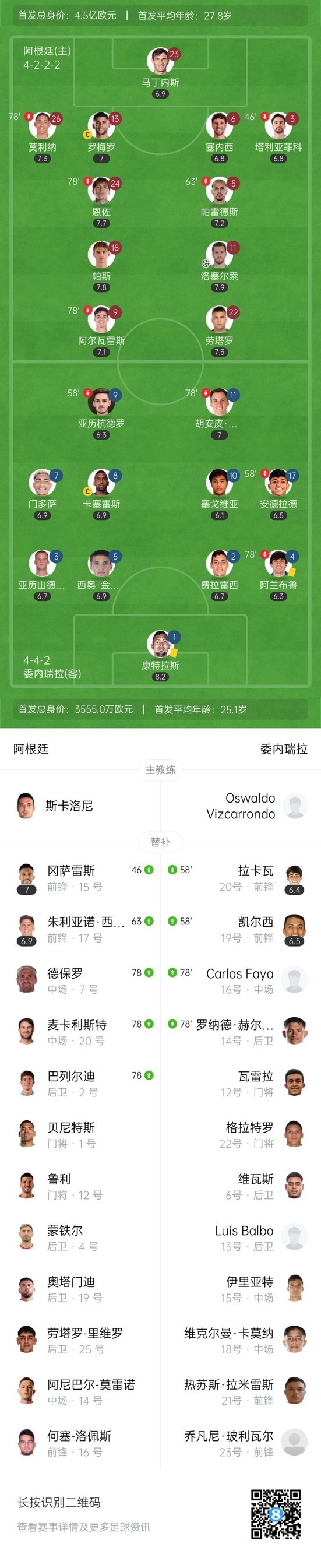下半场补时4分钟,阿根廷1-0委内瑞拉。 两边首发以及换东谈主信息: