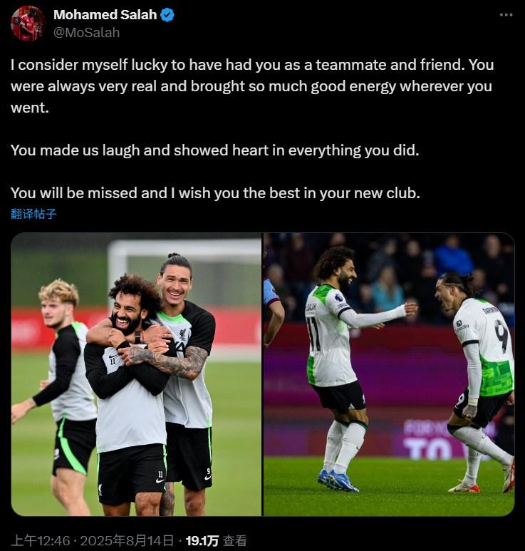 ![]() 直播吧8月14日讯 当天,利物浦边锋萨拉赫更新了个东谈主推特,告别 了此前晓示离队的努涅斯。 萨拉赫写谈:我很走时能当你的队友和一又友,你老是很古道,岂论在哪你齐能带来满满的正能量。 你让咱们舒怀大笑,所作念的每件事情齐展现出了你的温雅地。 咱们会念念念你的,祝你在新的俱乐部一切凯旋。 |