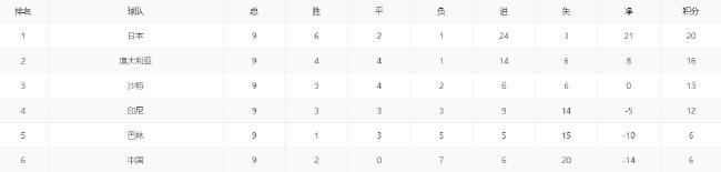 C组地点相似明确,日本提前两轮出线,澳大利亚上轮在日本队身上拿到3分,天然与第三名收支3分,但凭借8个净胜球的差距,也基本生效锁定第二个出线限额,名次序三的沙特和第四的印尼在上轮全取3分,生效拿下附加赛限额,巴林和中国队则分列5、6位提前出局,末轮仅为荣誉而战。