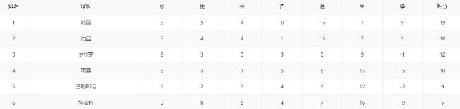 B组地点仍有悬念,韩国和约旦折柳位列小组前两名笃定出线限额,小组第三名伊拉克积12分,第四名阿曼10分,第五名巴勒斯坦9分,将争夺两个附加赛限额,其中巴勒斯坦和阿曼在末轮将奏凯对话,他们当中的胜者奏凯赢得附加赛限额,若平局则巴勒斯坦出局,第六名科威特提前出局。