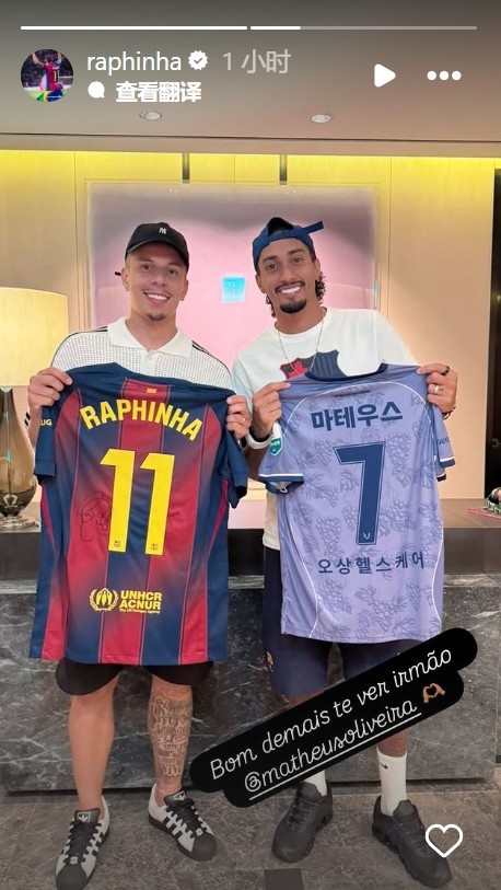 8月1日讯 拉菲尼亚更新社媒,晒出与安阳FC球员马修斯-奥利维拉交换球衣的相片。 巴萨正在韩国进行季前友谊赛,他们7月31日7-3打败首尔FC。赛后,拉菲尼亚晒出与K1联赛安阳FC球员马修斯-奥利维拉交换球衣的相片,并配文:很欢笑见到你,兄弟。 马修斯-奥利维拉现年27岁,这位缺欠手此前一直效率于巴西联赛,旧年加盟安阳FC,本赛季出战22场K联赛,孝顺7球1助攻。 |