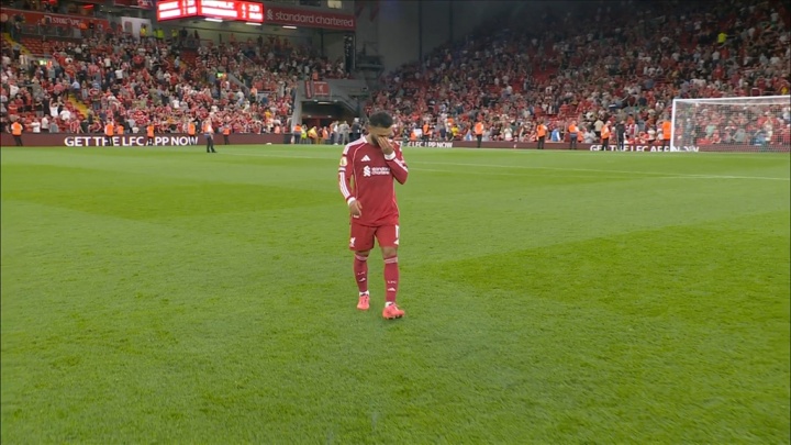 08月16日讯 利物浦4-2打败伯恩茅斯,赛后,安菲尔德球迷们呼吁若塔的名字。 萨拉赫站在场内,对着球迷们长本领饱读掌,镜头给到他依然满脸泪水。
