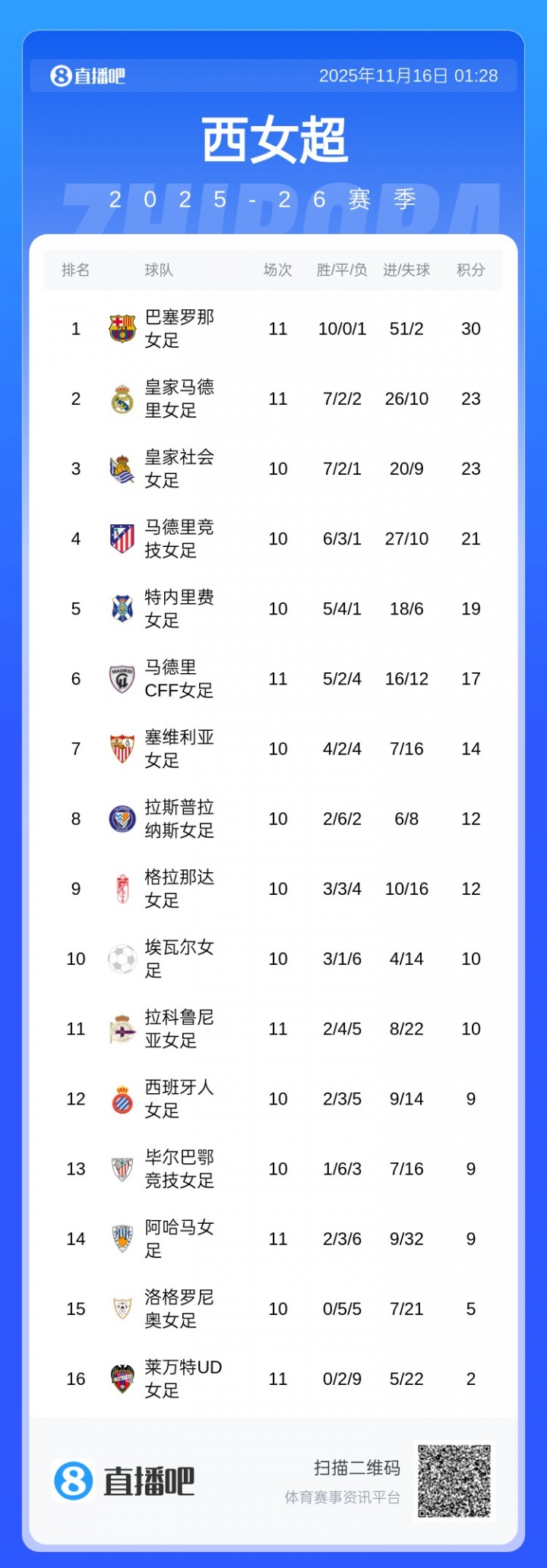 11月16日讯 西女超第11轮,巴萨女足主场4-0大捷皇马女足,获取女足国度德比。本场比赛,帕约尔梅开二度,邦马蒂替补立功。 本场比赛后,巴萨女足11轮10胜1...